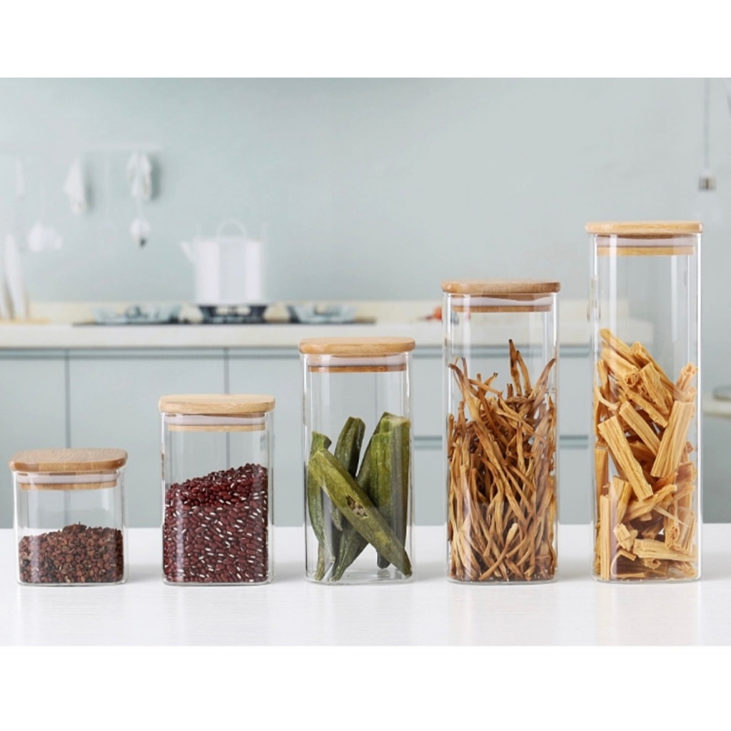 Kit 5 Potes De Vidro para Mantimentos com Tampa Bambu quadrado 200ml 250ml 300ml 400ml 550ml